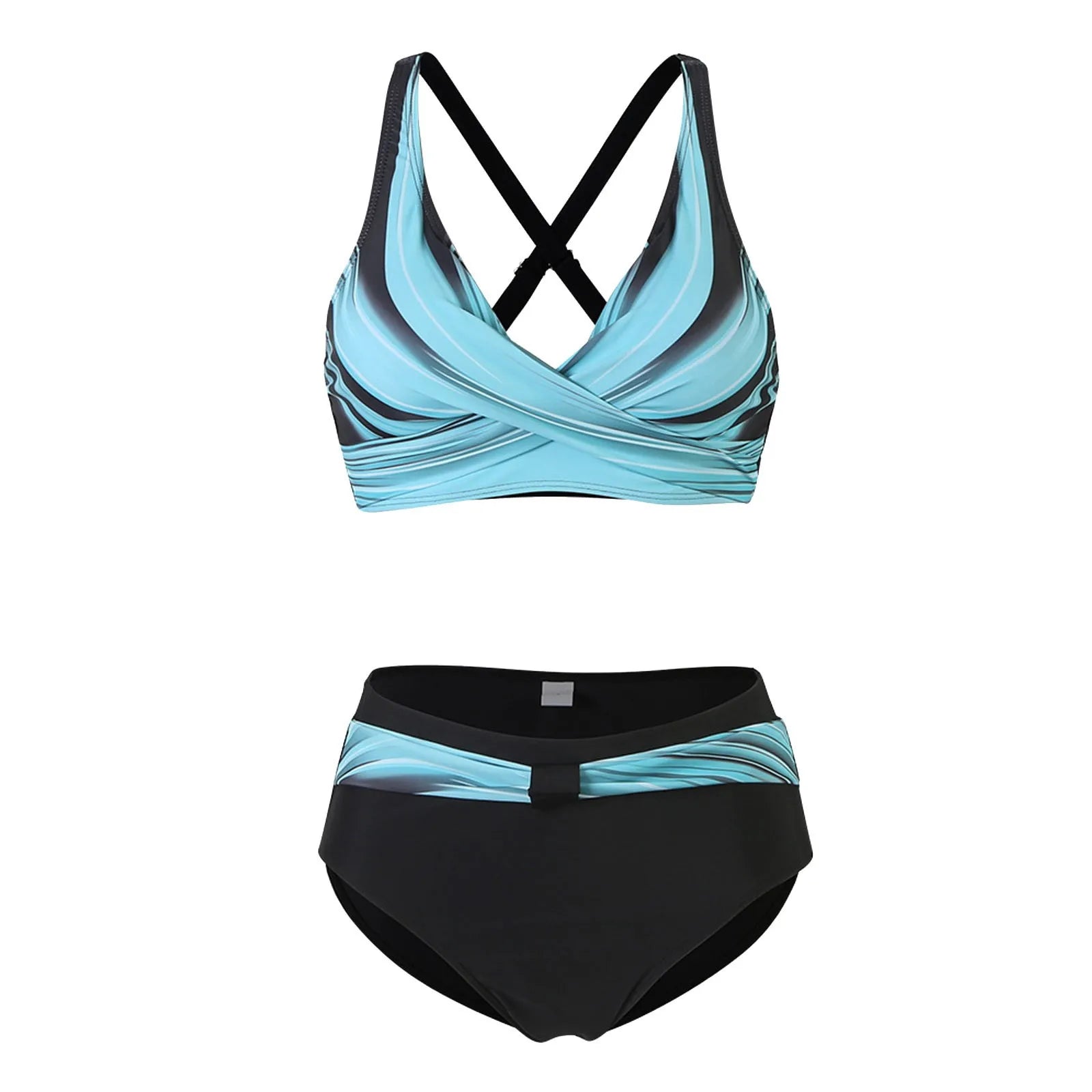 High Waist Women's Bikini 2024 Lace-Up Push-Up Ruched Two-Piece Swimwear Color Block Sexy Beach Style Polyester Tankini Set